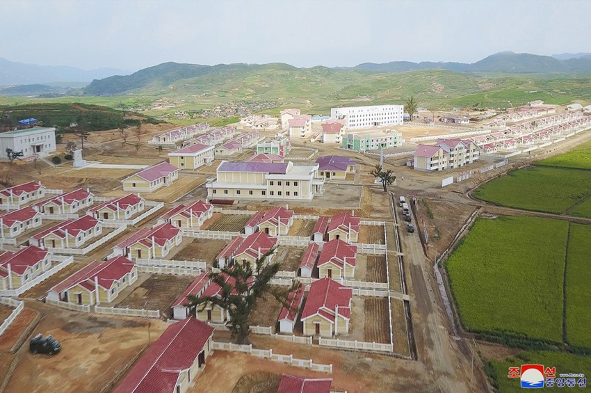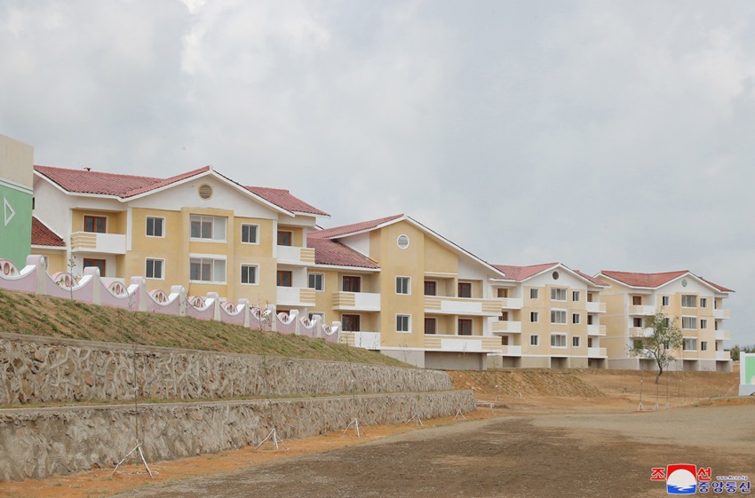 H.E. Kim Jong Un cutting the tape at the inauguration ceremony of the Pothong Riverside Terraced Houses District in April...