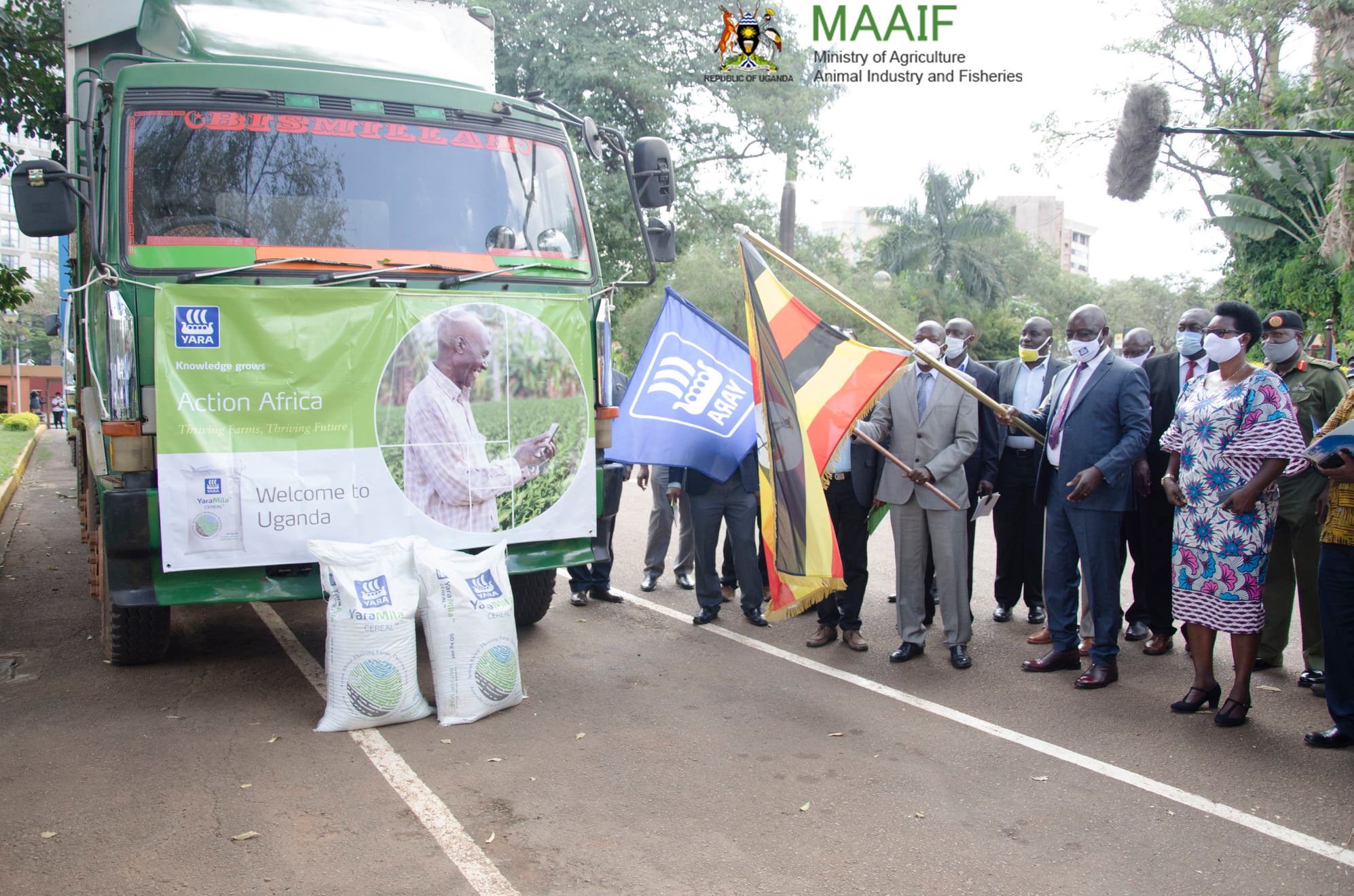 On 24 October 2020, The Minister for Agriculture, Animal Industry and Fisheries Hon. Vincent Bamulangaki Ssempijja, flagged off consignments of 2,700 metric tonnes of fertiliser for distribution to 23,000 Maize farmers in 40 districts in Uganda.