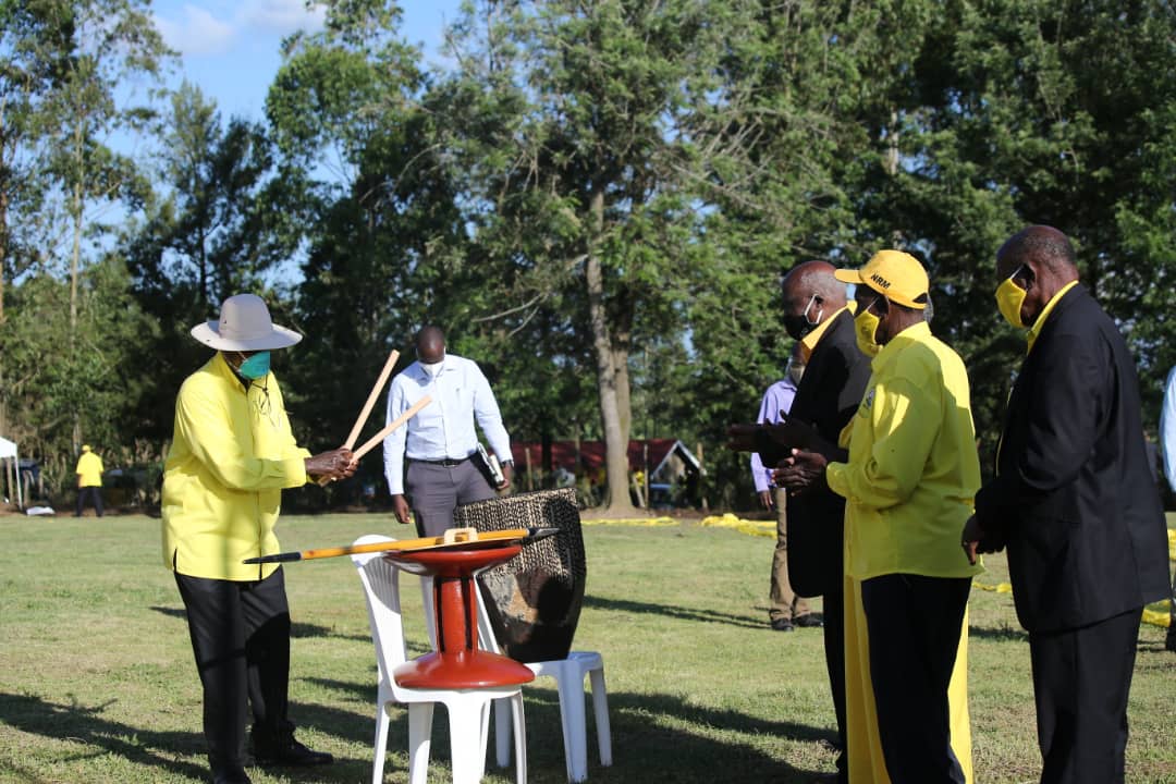 At the end of his address, the NRM presidential candidate was given symbolic gifts of traditional regalia including a spear, shield, stool and drum from the leaders from Greater Bushenyi.